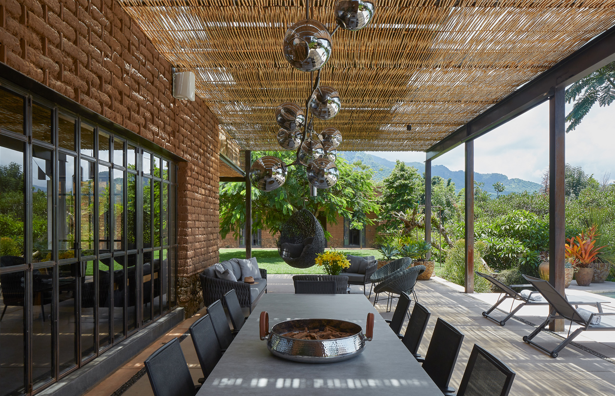 Del lado izquierdo, el jardín propone un recorrido distinto: un sendero de arcos de herrería cubiertos de enredaderas, acompañado por cítricos y romero que despiertan los sentidos con su fragancia. Este trayecto culmina bajo la sombra de un gran árbol que sostiene orquídeas, un rincón íntimo y acogedor donde se ubica el firepit, perfecto para cerrar el día entre charla y fuego.