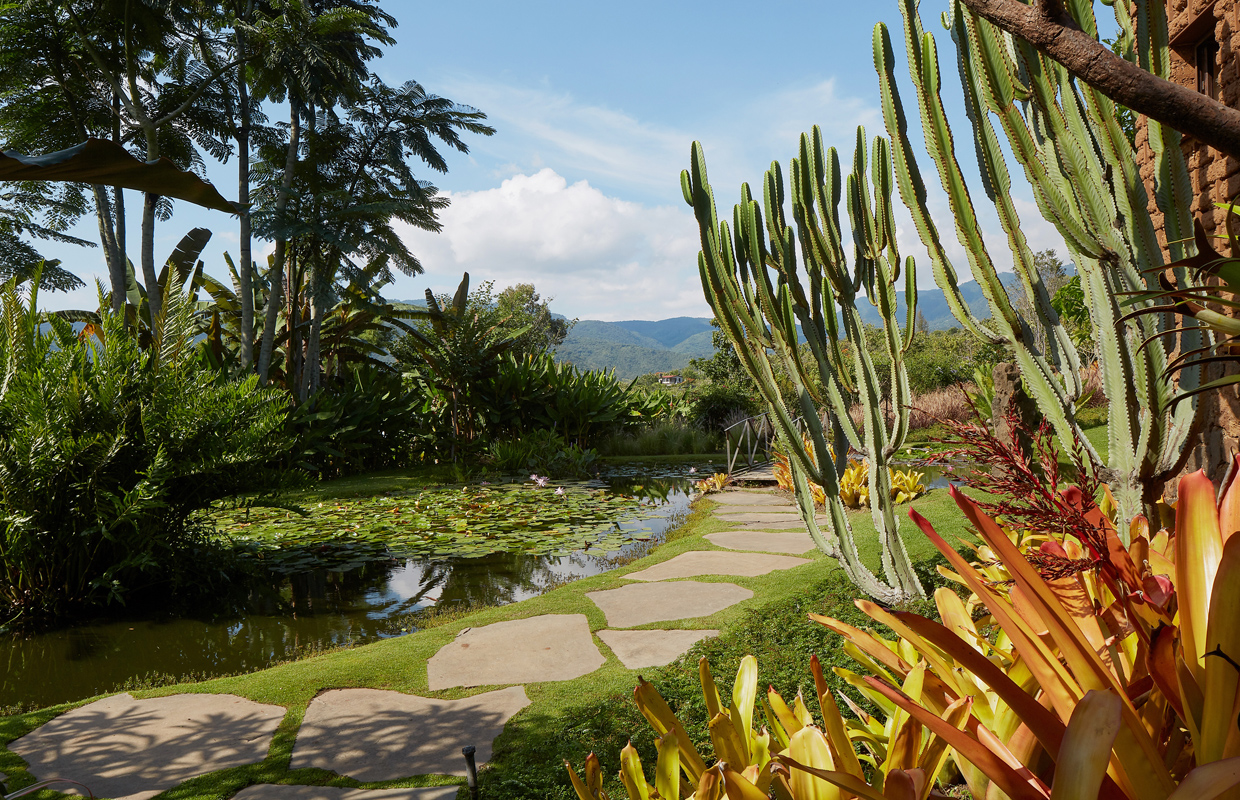 En el lado derecho, la experiencia se viste de color y aromas con bromelias y especies exóticas, que enmarcan un sendero de lajas hasta llegar a un paisaje abierto de penisetum ondulante. Este recorrido guía hacia el corazón del proyecto: un lago con ninfas acuáticas, rodeado de huellas que permiten pasear entre el agua y los árboles que protegen la vista, creando un escenario mágico y envolvente.